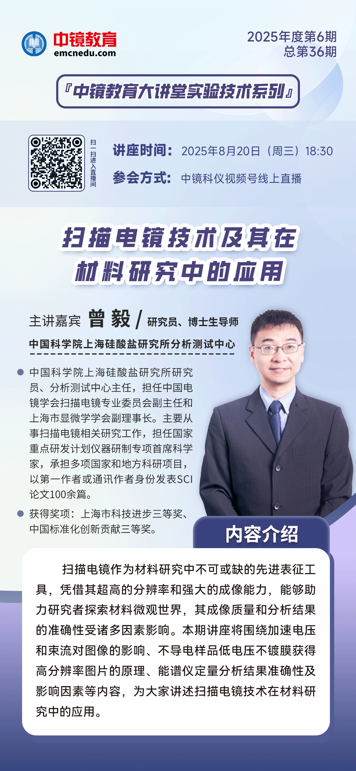 講座回放 為推動實驗技術的蓬勃發展,打造行業學習交流的平臺,由中鏡教育發起的2025年“中鏡教育大講堂”第六期-“實驗技術系列”講座圓滿結束! 掃描電鏡作為材料研究中不可或缺的先進表征工具,憑借其超高的分辨率和強大的成像能力,能夠助力研究者探索材料微觀世界,其成像質量和分析結果的準確性受諸多因素影響。本期特邀中科院上海硅酸鹽研究所分析測試中心主任曾毅研究員為我們帶來了《掃描電鏡技術及其在材料研究中的應用》的專題講座。本期講座從掃描掃描電鏡的技術特點切入,圍繞加速電壓和不同電子信號的選擇對圖像的影響、不同廠家掃描電鏡放大倍數的定義、景深的定義及影響景深的因素、掃描電鏡獲得高分辨圖像的影響因素有哪些、不導電樣品低電壓不鍍膜獲得高分辨率圖片的原理等內容,深入講述了掃描電鏡技術在材料研究中的應用。內容詳實,深入淺出,精彩非凡! 現將本期講座回放發布,供大家學習,歡迎大家觀看! 講座回放