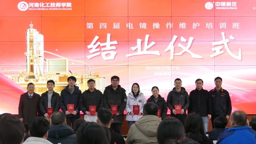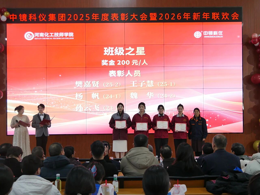【廿載同行 共鑄輝煌】 中鏡科儀集團(tuán)2025年度表彰大會(huì)暨 2026年新年聯(lián)歡會(huì)成功舉行! 2025年12月27日下午,以“廿載同行 共鑄輝煌”為主題的中鏡科儀集團(tuán)2025年度表彰大會(huì)暨2026年新年聯(lián)歡會(huì),在河南化工技師學(xué)院現(xiàn)代化工實(shí)訓(xùn)大樓617報(bào)告廳隆重舉行。大會(huì)設(shè)立開封主會(huì)場(chǎng)及北京、南京、廣州、沈陽、西安、北美六大分會(huì)場(chǎng),中鏡科儀集團(tuán)全體員工、河南化工技師學(xué)院檢驗(yàn)檢測(cè)產(chǎn)業(yè)學(xué)院全體師生及相關(guān)單位代表齊聚一堂,共慶廿載榮光,啟航新程。 會(huì)議現(xiàn)場(chǎng) 大會(huì)在莊嚴(yán)而熱烈的氛圍中拉開序幕。多位行業(yè)頂尖專家學(xué)者與中鏡科儀集團(tuán)及合作院校的領(lǐng)導(dǎo)共同出席本次盛會(huì)。出席會(huì)議的專家領(lǐng)導(dǎo)有:第三屆電子顯微鏡技術(shù)專業(yè)教育教學(xué)指導(dǎo)委員會(huì)專家教授——楊勇驥(海軍軍醫(yī)大學(xué))、洪健(浙江大學(xué))、李炎(河南科技大學(xué))、陳明霞(西安交通大學(xué))、崔麗(吉林大學(xué))、范光(核工業(yè)北京地質(zhì)研究院)、李吉學(xué)(浙江大學(xué));特邀專家——河北醫(yī)科大學(xué)原電鏡實(shí)驗(yàn)中心主任、中國(guó)電鏡學(xué)會(huì)生物醫(yī)學(xué)專業(yè)委員會(huì)主任委員、首屆電鏡技術(shù)專家咨詢委副主任委員馬洪駿教授,西安交通大學(xué)王鵬教授,上海大學(xué)工程師寇春合;合作院校領(lǐng)導(dǎo)及中鏡科儀集團(tuán)——河南化工技師學(xué)院黨委委員、副校長(zhǎng)趙峰,河南化工技師學(xué)院檢驗(yàn)檢測(cè)產(chǎn)業(yè)學(xué)院副院長(zhǎng)李曉英、火隆、王振峰,微束科技集團(tuán)、中鏡科儀集團(tuán)董事長(zhǎng)、河南電鏡學(xué)會(huì)副理事長(zhǎng)、第三屆電鏡專業(yè)教指委委員兼秘書長(zhǎng)、首屆電鏡技術(shù)專家咨詢委委員兼秘書長(zhǎng)郭新勇,微束科技集團(tuán)副總經(jīng)理、中鏡科儀集團(tuán)總經(jīng)理任江鳴,微束科技集團(tuán)副總經(jīng)理、中科百測(cè)集團(tuán)總經(jīng)理許耀華,中鏡科儀集團(tuán)副總經(jīng)理王萍,中鏡科儀科技副總、河南大學(xué)教授張普濤,菲泰姆品牌總經(jīng)理董保杰等。中鏡科儀各地區(qū)負(fù)責(zé)人及全體員工和電鏡專業(yè)應(yīng)往屆畢業(yè)生在線參會(huì)。大會(huì)由中鏡科儀集團(tuán)市場(chǎng)中心孔德勝、李夢(mèng)娜與電鏡專業(yè)25級(jí)學(xué)生劉天送、侯錦譽(yù)共同主持。 校企聯(lián)合主持節(jié)目 大會(huì)伊始,河南化工技師學(xué)院黨委委員、副校長(zhǎng)趙峰致辭,他在致辭中回顧校企共建電鏡專業(yè)成果,強(qiáng)調(diào)產(chǎn)教融合多方共贏,提出未來深化合作、擴(kuò)大國(guó)際交流及強(qiáng)化社會(huì)服務(wù)三大展望,通過校企合作使電鏡專業(yè)再創(chuàng)輝煌。 趙峰致辭 大會(huì)期間,第四屆電鏡操作維護(hù)培訓(xùn)班結(jié)業(yè)儀式在年會(huì)中舉行。該培訓(xùn)班以夯實(shí)電鏡人才實(shí)操能力、助力行業(yè)技術(shù)水平提升為核心目標(biāo)。海軍軍醫(yī)大學(xué)教授楊勇驥致辭,祝賀學(xué)員結(jié)業(yè)并勉勵(lì)大家理論結(jié)合實(shí)踐、創(chuàng)新提能。廣州國(guó)家實(shí)驗(yàn)室陳偉棟作為學(xué)員代表致謝,表示將學(xué)以致用,為電鏡領(lǐng)域發(fā)展貢獻(xiàn)力量。隨后,趙峰、郭新勇、寇春合共同為學(xué)員頒發(fā)結(jié)業(yè)證書。 楊勇驥致辭 陳偉棟作為學(xué)員代表發(fā)言 頒發(fā)結(jié)業(yè)證書合影 本次年會(huì)設(shè)置了多項(xiàng)表彰環(huán)節(jié),其中特別設(shè)置了“科普達(dá)人頒獎(jiǎng)”環(huán)節(jié)。開封市科學(xué)技術(shù)協(xié)會(huì)正式聘任中鏡科儀集團(tuán)的郭新勇、張康、郭芳銘、趙勝藍(lán)、裴霞5人為2025年度“開封市科普達(dá)人”。這一聘任不僅是對(duì)中鏡科儀長(zhǎng)期深耕電鏡科普領(lǐng)域、助力全民科學(xué)素質(zhì)提升的高度認(rèn)可與充分肯定,彰顯了企業(yè)在推動(dòng)科學(xué)知識(shí)普及、營(yíng)造良好科學(xué)氛圍方面的積極貢獻(xiàn);更通過樹立科普榜樣,激勵(lì)更多人投身科普事業(yè),激發(fā)社會(huì)各界對(duì)科學(xué)知識(shí)的關(guān)注與熱情,為提升全民科學(xué)素養(yǎng)注入強(qiáng)大動(dòng)力。現(xiàn)場(chǎng),楊勇驥教授為科普達(dá)人頒發(fā)榮譽(yù)聘書,趙勝藍(lán)、裴霞代表領(lǐng)獎(jiǎng),贏得全場(chǎng)熱烈掌聲。 科普達(dá)人合影 2025年,中鏡科儀集團(tuán)與河南化工技師學(xué)院檢驗(yàn)檢測(cè)產(chǎn)業(yè)學(xué)院深化產(chǎn)教融合成果顯著,在年度表彰中特別聚焦電鏡專業(yè)學(xué)生成長(zhǎng)——對(duì)優(yōu)秀學(xué)子予以隆重表彰,既展現(xiàn)了校企協(xié)同育人模式下高素質(zhì)技術(shù)技能人才的培育成效,也為職業(yè)教育服務(wù)科研創(chuàng)新提供了生動(dòng)范本。同期,中鏡科儀集團(tuán)對(duì)內(nèi)部員工進(jìn)行表彰,涵蓋個(gè)人貢獻(xiàn)、管理創(chuàng)新及跨部門協(xié)作典范等領(lǐng)域,通過樹立標(biāo)桿強(qiáng)化“奮斗者文化”,既肯定了員工在挑戰(zhàn)中砥礪