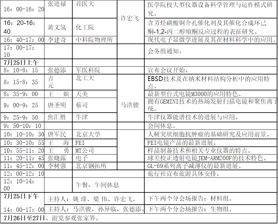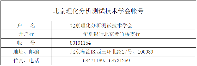 正 式 邀 請 函 華北五省市電子顯微鏡學會和北京理化分析測試技術學會定于2010年7月23-27日在湖南張家界舉辦“第六次華北五省市電子顯微學研討會及第八屆全國實驗室協作服務交流會”。會期5天。具體事項通知如下: 一、會議日期及報到時間: 會議日期:2010年7月23-27日(星期五至星期二) 報到時間:2010年7月23日(星期五)。全天。 希望各參展商有關人員希望能夠提前到達會場。 二、會議報到和住宿地址:張家界市機場路,張家界天門山大酒店。 貴公司需在此酒店住宿的人數和間數請盡快告知會務組于靖琦秘書(聯系方式見后)。 住宿費:180元/間。 三、 乘車路線: 1、張家界荷花機場:0.3 公里(步行8分鐘即到)。 2、張家界火車站:8 公里 (打的12元)。 四、各公司有關會議的展品、廣告宣傳、資料禮品等,請在2010年7月23日(星期五)下午6:00之前送到會議地點,并布置妥當。會場墻壁不許張貼,請自備掛架等物品。會議會場的聯系人和聯系電話如下:于靖琦:13521470325。如果公司需要郵寄物品,其聯系地址和聯系人如下:張家界機場路天門山大酒店,郵編:427000,郵寄物品接收人:銷售部:劉國輝,0744-8257888。 五、各公司參展的費用,如果需要開發票的,請在收到正式邀請函后,盡快把相關費用:2500 RMB(包括展示儀器、展板、發放資料禮品并包括一人的飯費和旅游費等。)直接寄到以下帳號(見后表格)。 會計聯系人和聯系電話:于靖琦:010-68731259,13521470325。款到發票及時寄出。 如果不需要開發票的,會議也可以開收據的方式收取你們的參展費用(會議當天交費便可)。 六、 組委會根據各參展公司的報名先后順序和報告內容,安排了“學術報告時間安排表”(附后)希望能夠得到貴公司能夠理解和支持。會場僅備有音響設備和投影儀,請各公司自帶筆記本電腦,或自備投影儀。 七、會議負責人的具體聯系地址、聯系電話、郵箱如下: A、聯 系 人:北京理化分析測試技術學會 于靖琦 聯系電話:010-68731259、88517114,13521470325。 E-mail: VIP001@21cn.com B、北京市海淀區太平路27號,國家生物醫學分析中心,張德添 ,郵編100850。 聯系電話:13366267269,010-86538247(小靈通),66931481(辦), EMAIL:zhangdetian2008@126.com 華北五省市電子顯微鏡學會和北京理化分析測試技術學會非常感謝你們的參與和對會議的積極支持。我們將保證提供一切方便和條件。預祝我們合作順利滿意。 此致敬禮! 華北五省市電子顯微鏡學會 2010年6月1日 附圖: 會計聯系人和聯系電話:于靖琦:010-68731259,13521470325 第六次華北五省市電子顯微學研討會 及第八屆全國實驗室協作服務交流會日程安排表 (2010年7月23日-27日,湖南省張家界)