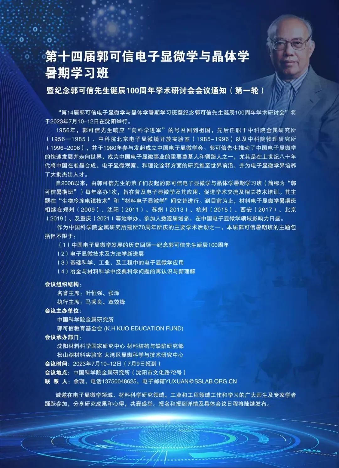 【會議通知】第十四屆郭可信電子顯微學與晶體學暑期學習班暨紀念郭可信先生誕辰100周年學術研討會會議通知(第一輪)