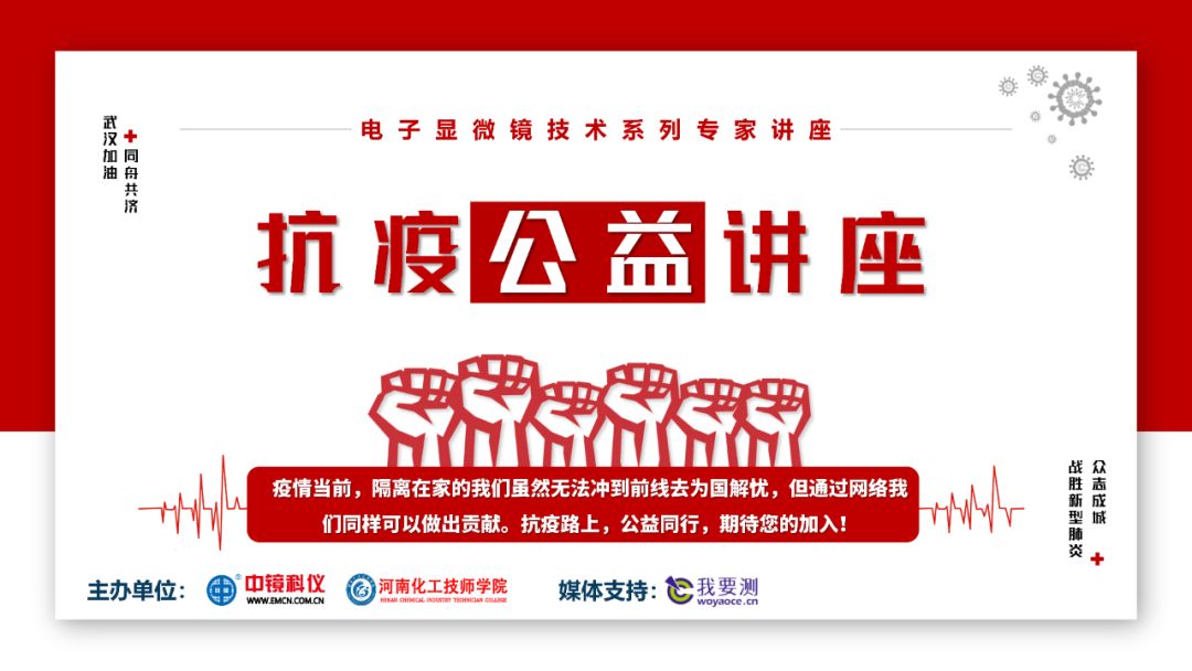疫情當(dāng)前,我們“停工不停學(xué)”。由中鏡科儀、河南化工技師學(xué)院、我要測(cè)網(wǎng)共同發(fā)起的“線(xiàn)上公益課 助力防疫戰(zhàn):抗疫公益講座”活動(dòng)圓滿(mǎn)結(jié)束,共計(jì)四期,20節(jié)課程,內(nèi)容“硬核”,初心依舊! 2020年的春天,疫情突然爆發(fā),給我們帶來(lái)了始料未及的沖擊。隔離在家的我們雖然無(wú)法沖到前線(xiàn)去為國(guó)解憂(yōu),但通過(guò)網(wǎng)絡(luò)我們同樣可以做出屬于我們的貢獻(xiàn)。 疫情發(fā)生后,中鏡科儀本著“堅(jiān)持黨的領(lǐng)導(dǎo)、“堅(jiān)持校企合作”、“堅(jiān)持育人理念”、“堅(jiān)持服務(wù)行業(yè)”、“堅(jiān)持面向世界的理念”,聯(lián)合河南化工技師學(xué)院和我要測(cè)網(wǎng),積極響應(yīng)教育部及人社部的號(hào)召,組織開(kāi)展此次“線(xiàn)上公益課 助力防疫戰(zhàn):抗疫公益講座”活動(dòng)。 在為期一個(gè)月的時(shí)間里,來(lái)自世界各地的二十位電鏡專(zhuān)家,為我們帶來(lái)了一場(chǎng)場(chǎng)精彩的視聽(tīng)盛宴。 各位專(zhuān)家在接到此次公益講座倡議書(shū)后,積極響應(yīng)并投入大量精力備課,將所學(xué)、所知、所想、所悟,傾囊相授,做到了“傳承技藝、堅(jiān)守本心”。為新一代電鏡人樹(shù)立了榜樣,引起了強(qiáng)烈的社會(huì)反響,受到了一致好評(píng)。 (點(diǎn)擊可查看20位專(zhuān)家講座的視頻回放) 此次講座直播頁(yè)面總瀏覽量超2萬(wàn)人次,直播間參與人次15542人次,講座回放總瀏覽量超16000次,直播總時(shí)長(zhǎng)2337分鐘,會(huì)后問(wèn)答505個(gè),獲得良好的社會(huì)反響。尤其是在這個(gè)疫情特殊時(shí)期,雖然我們并未走上“前線(xiàn)”,但我們也在為國(guó)家、為行業(yè)做著自己的貢獻(xiàn)。 在這個(gè)特殊時(shí)期,各位專(zhuān)家勇于擔(dān)當(dāng),甘于奉獻(xiàn),沖在了抗疫工作的第一線(xiàn)。他們就是我們行業(yè)的楷模!還有各位積極參與聽(tīng)講的老師和同學(xué)們,響應(yīng)國(guó)家號(hào)召“停工停課不停學(xué)”,隔離期間依然堅(jiān)持學(xué)習(xí)。 我們所有的工作都會(huì)在這一特殊歷史時(shí)期下,成為助力科學(xué)事業(yè),推動(dòng)行業(yè)發(fā)展,促進(jìn)身心健康的源動(dòng)力,這些故事都將載入中國(guó)電鏡史的史冊(cè)。 致辭 河南化院副校長(zhǎng)管錚高度贊揚(yáng)了二十位電鏡屆頂尖專(zhuān)家學(xué)者的無(wú)私奉獻(xiàn)精神和社會(huì)責(zé)任感。 聽(tīng)線(xiàn)上公益課,助防疫攻堅(jiān)戰(zhàn)。 懷揣公益初心,全程重磅干貨。 專(zhuān)家愛(ài)心講授,傳承電鏡精神。 此次抗疫公益講座活動(dòng)圓滿(mǎn)結(jié)束! 致謝:最后感謝20位電鏡專(zhuān)家?guī)?lái)的精彩講座,感謝中鏡科儀各位臺(tái)前幕后的主持工作者,感謝河南化工技師學(xué)院領(lǐng)導(dǎo)和參與策劃的工作人員以及我要測(cè)網(wǎng)直播平臺(tái)的影視編輯和媒體宣傳。 講課專(zhuān)家(按報(bào)告順序排序):鄧昱、祝建、孫異臨、朱命煒、戴威、林中清、張仲凱、王建波、胡迎春、張巖、陳弘仁、陳文列、孫飛、郭振璽、雷建林、劉闖、劉效蘭、石洪波、郭新勇、張錦平; 策劃:郭新勇、楊箴立、安艷威; 總務(wù):管崢、董保杰、魏葆婷、王萍、郭運(yùn)波; 主持:程書(shū)潔、馬明、程亞光、趙勝藍(lán); 海報(bào):趙勝藍(lán)、王哲、李江偉; 微信:程璐琰; 后臺(tái):俞利平; 視頻剪輯:薛亞鵬。