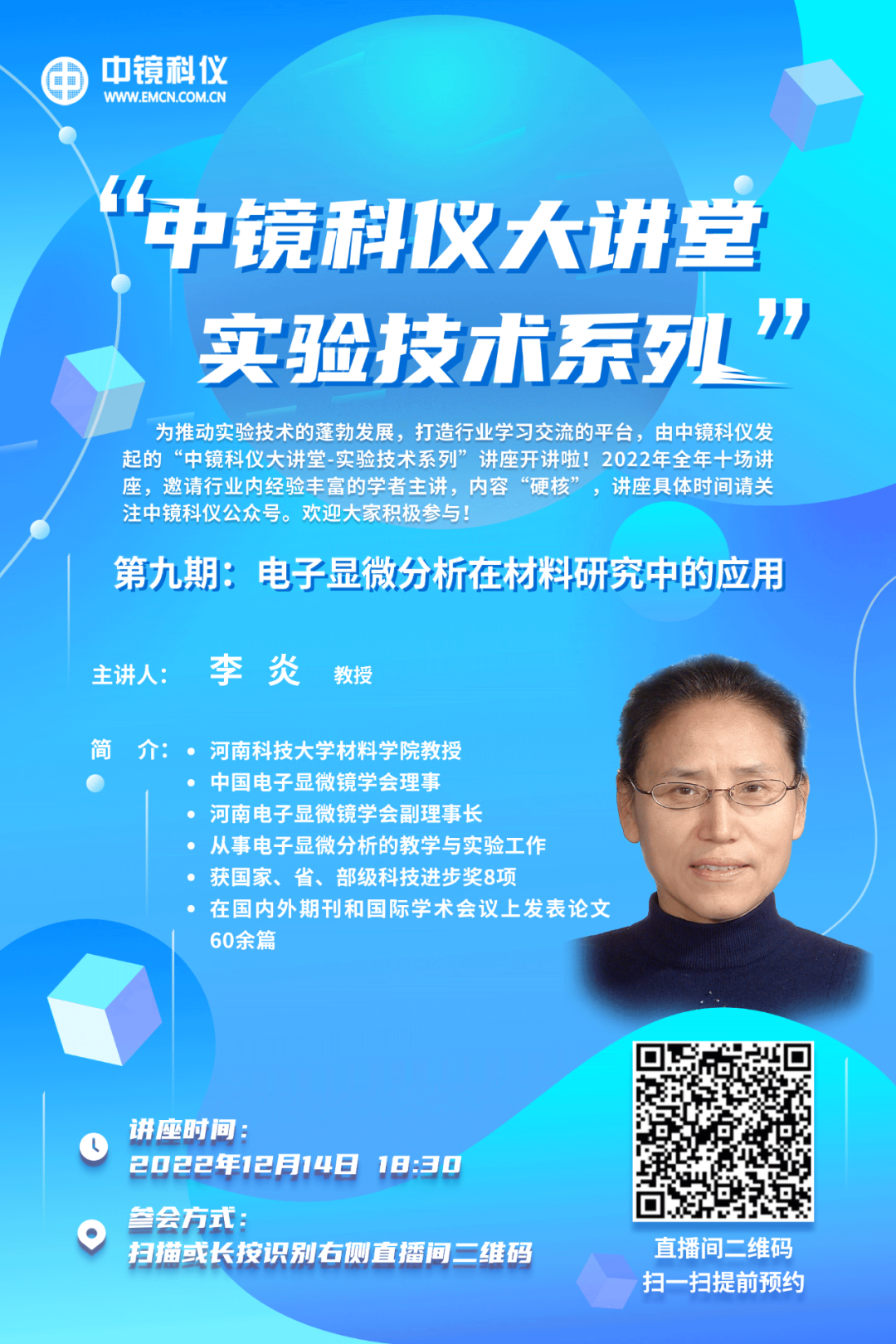 第九期:《電子顯微鏡分析在材料研究中的應用》-李炎 現將本期講座回放發布,供大家學習,歡迎大家觀看!本系列共十場講座,每月一期,具體時間請持續關注中鏡科儀公眾號,歡迎大家積極參與!