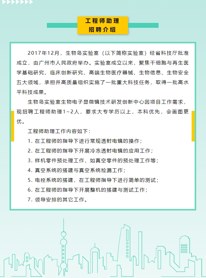 【行業(yè)招聘】生物島實驗室招聘工程師助理
