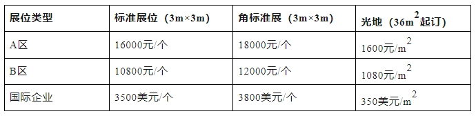 注:A.標(biāo)準(zhǔn)展位配備:中英文楣板(寬度25cm)、日光燈兩盞、隔板(高度250cm,可用高度246cm)、洽談桌一張、椅子兩把、可容400W/220V電源插座一個及地毯;